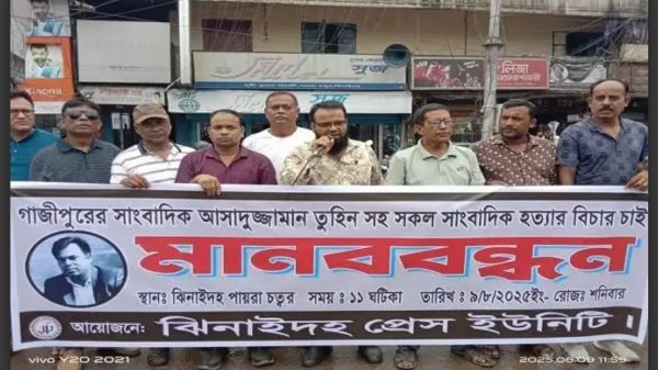সাংবাদিক তুহিন হত্যার প্রতিবাদে ঝিনাইদহ প্রেস ইউনিটির মানববন্ধন।