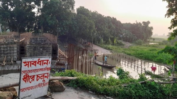 নওগাঁর আত্রাইয়ে খালের উপর নির্মাণাধীন ব্রিজের কাজ দুই মাসেও শেষ না হওয়ায় জনদুর্ভোগ চরম আকার ধারণ করেছে।