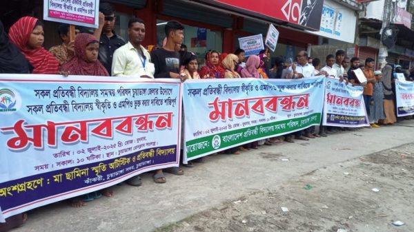 চুয়াডাঙ্গায় রাষ্ট্রীয় স্বীকৃতি ও এমপিওভুক্তির দাবিতে প্রতিবন্ধী শিক্ষার্থী ও শিক্ষকদের মানববন্ধন অনুষ্ঠিত।